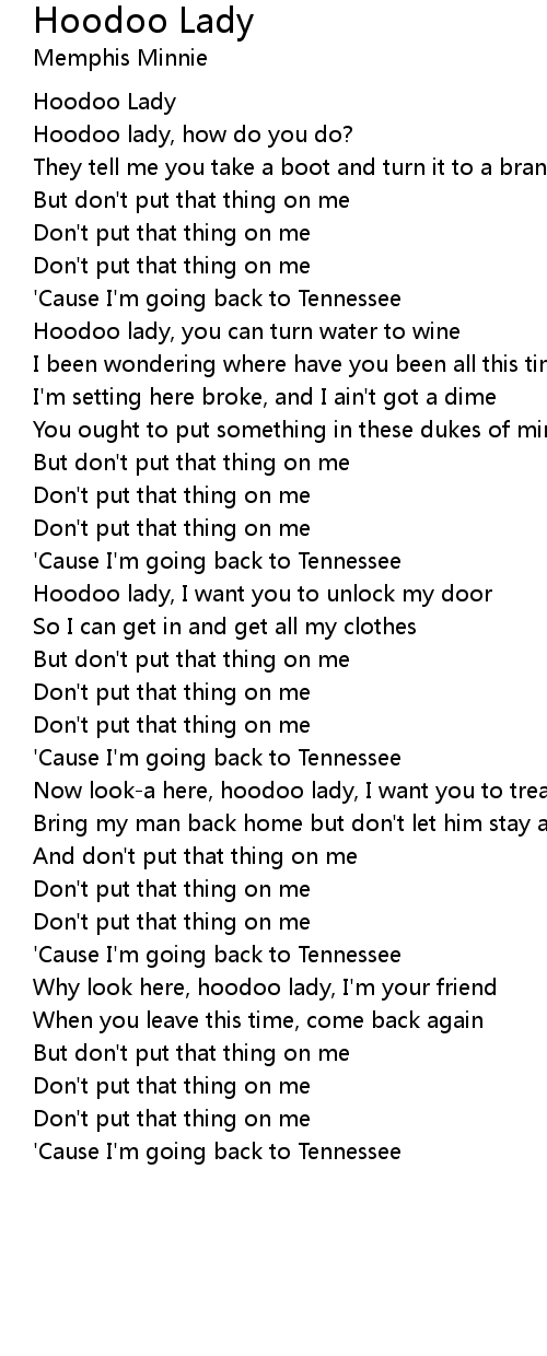 Now look-a here, hoodoo lady, I want you to treat me right |