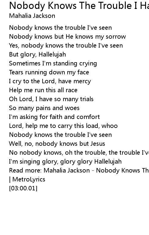 [02:58.70] Read more: Mahalia Jackson - Nobody Knows The Trouble I've Seen Lyrics | MetroLyrics