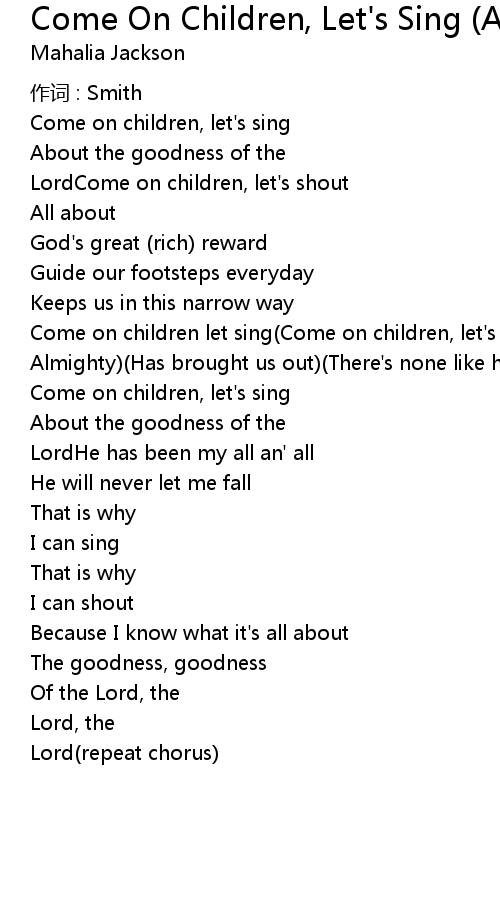 | Come on children let sing Come on children, let' s shout How the Lord Almighty Has brought us out There' s none like him Without a doubt | |