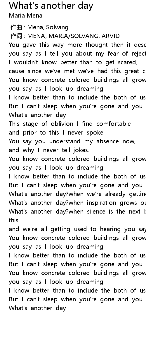 | [00:01.00] | 作词 : MENA, MARIA/SOLVANG, ARVID |