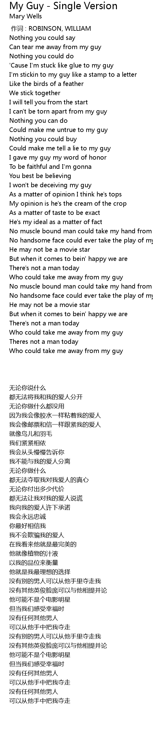 | [00:30.50] | I can't be torn apart from my guy |