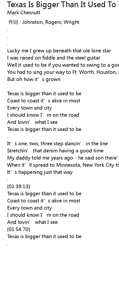 | [01:39.69] | Texas is bigger than it used to be |