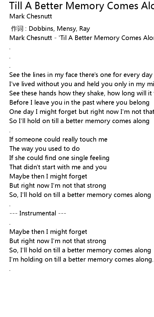 | [00:00.01] | Mark Chesnutt ' Til A Better Memory Comes Along |