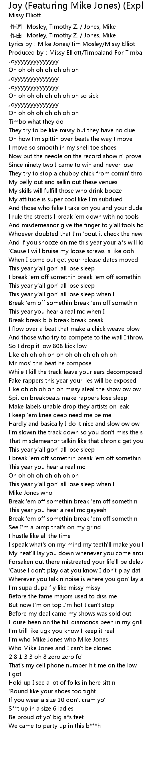 | [00:01.30] | Lyrics by: Mike Jones Tim Mosley Missy Elliot |