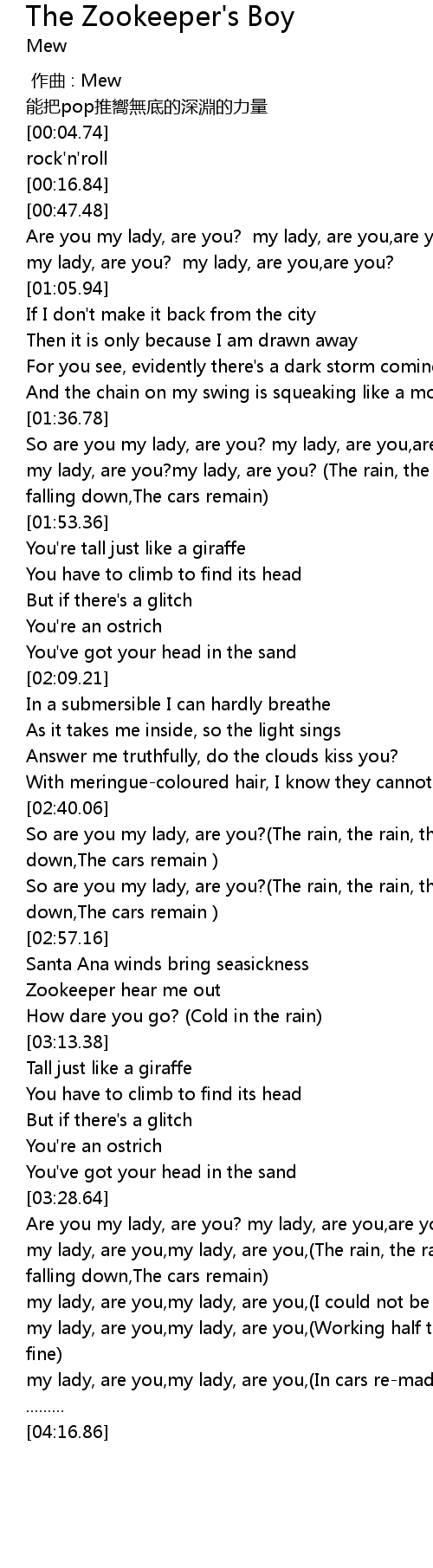 | [01:45.01] | my lady, are you?my lady, are you? (The rain, the rain, the rain is falling down,The cars remain) |