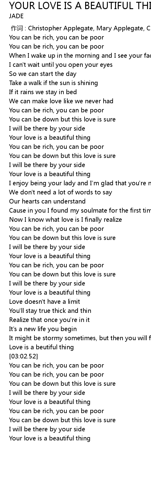 | [01:33.70] | I enjoy being your lady and I' m glad that you' re my man |