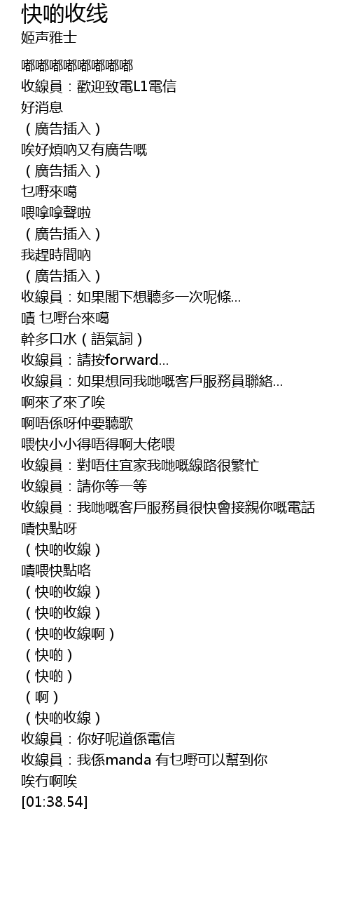 | [00:39.76] | 收線員:如果想同我哋嘅客戶服務員聯絡... |