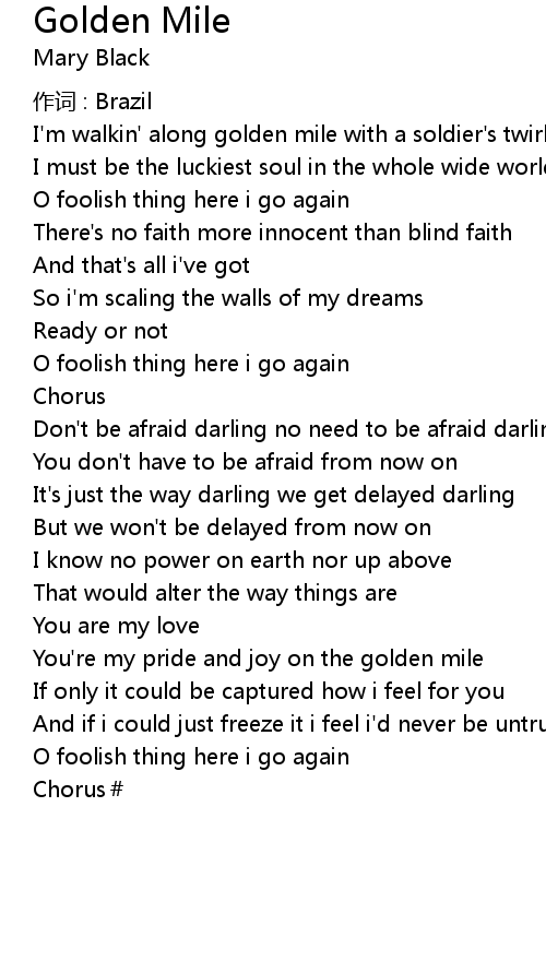 | I' m walkin' along golden mile with a soldier' s twirl | |