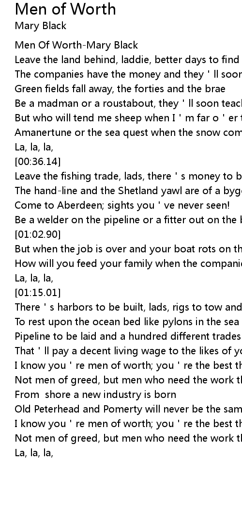 | [02:43.79] | Not men of greed, but men who need the work that's come your way |