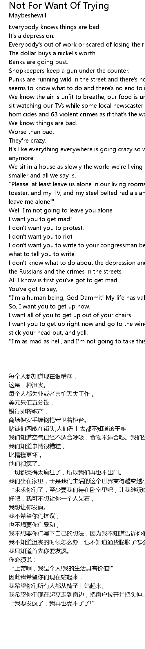 "I'm as mad as hell, and I'm not going to take this anymore!" |