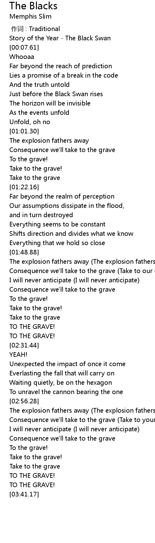 | [03:08.78] | Consequence we' ll take to the grave Take to your graves |