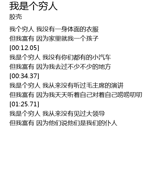 | [00:18.39] | 我是个穷人 我没有你们都有的小汽车 |