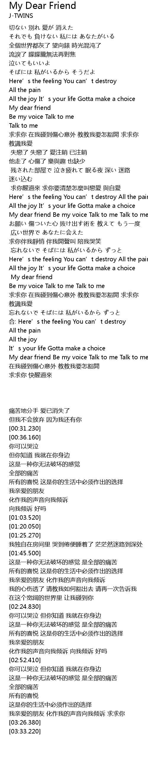 | [02:01.900] | My dear friend Be my voice Talk to me Talk to me |
