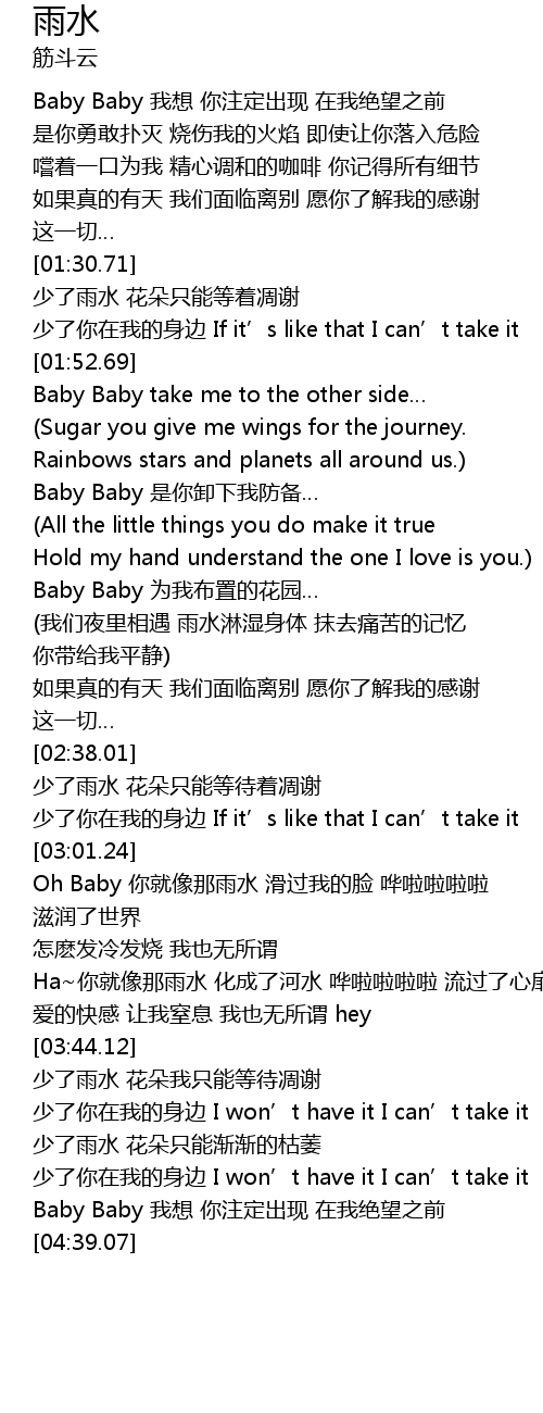 | [03:21.40] | Oh Baby 你就像那雨水 滑过我的脸 哗啦啦啦啦 滋润了世界 |