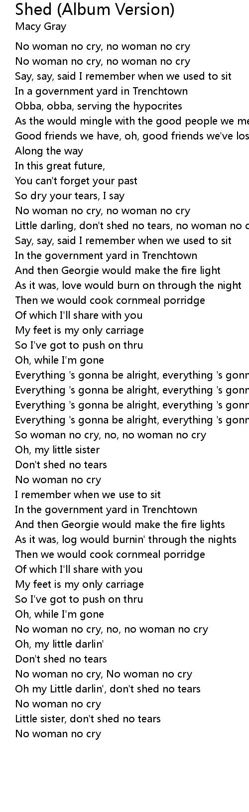 | Little darling, don't shed no tears, no woman no cry | |