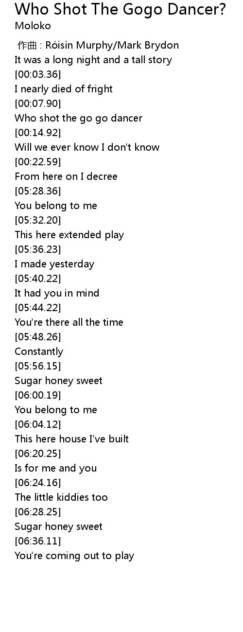 | [00:12.76] | Who shot the go go dancer |
