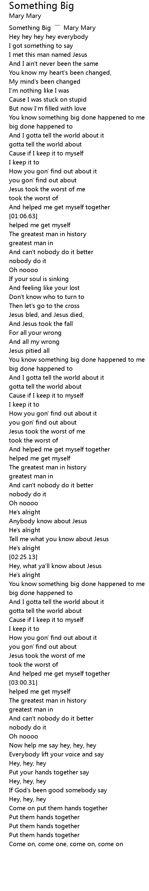 | [02:29.94] | Hey, what ya' ll know about Jesus |