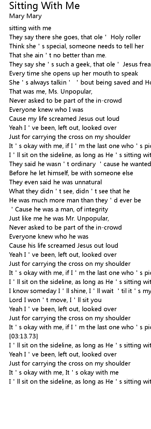 | [02:35.97] | I ll sit on the sideline, as long as He s sitting with me. |