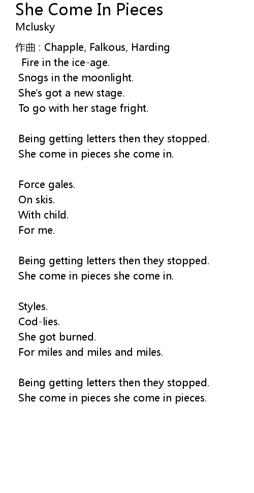 | She come in pieces she come in pieces. |
