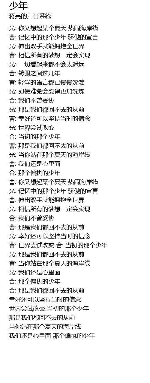 | [02:43.00] | 曹: 世界尝试改变 合: 当初的那个少年 |