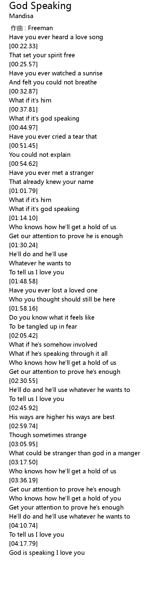 | [04:18.37] | God is speaking I love you |