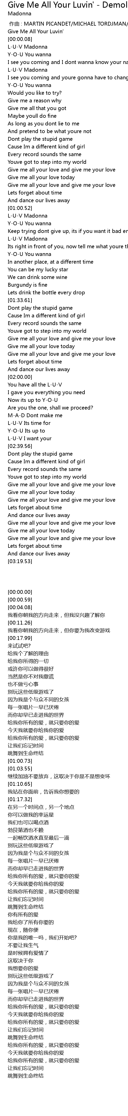 | [00:00.00] | Give Me All Your Luvin' |