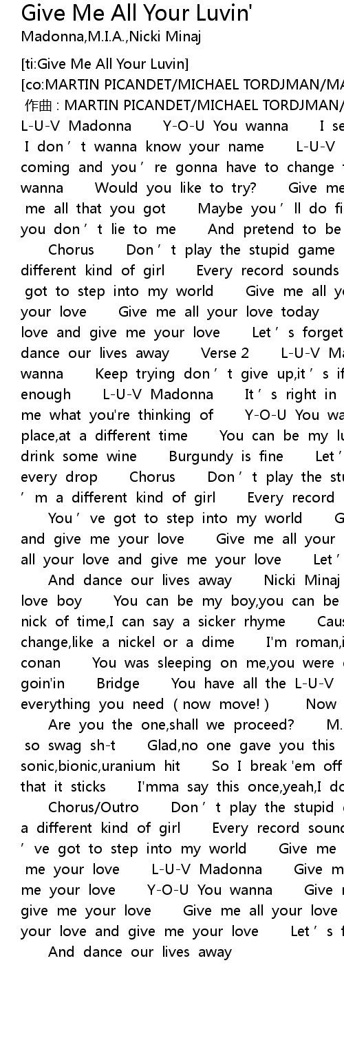 | [00:01.893] | LUV Madonna YOU You wanna I see you coming and I don ' t wanna know your name LUV Madonna I see you coming and you ' re gonna have to change the game YOU You wanna Would you like to try? Give me a reason why Give me all that you got Maybe you ' ll do fine As long as you don ' t lie to me And pretend to be what you ' re not Chorus Don ' t play the stupid game Cause I ' m a different kind of girl Every record sounds the same You ' ve got to step into my world Give me all your love and give me your love Give me all your love today Give me all your love and give me your love Let ' s forget about time And dance our lives away Verse 2 LUV Madonna YOU You wanna Keep trying don ' t give up, it ' s if you want it bad enough LUV Madonna It ' s right in front of you, now tell me what you' re thinking of YOU You wanna In another place, at a different time You can be my lucky star We can drink some wine Burgundy is fine Let ' s drink the bottle every drop Chorus Don ' t play the stupid game Cause I ' m a different kind of girl Every record sounds the same You ' ve got to step into my world Give me all your love and give me your love Give me all your love today Give me all your love and give me your love Let ' s forget about time And dance our lives away Nicki Minaj Give me all your love boy You can be my boy, you can be my boy toy In the nick of time, I can say a sicker rhyme Cause it' s time for change, like a nickel or a dime I' m roman, i' m a barbarian, i' m conan You was sleeping on me, you were dosin' Now move, im goin' in Bridge You have all the LUV I gave you everything you need now move! Now it ' s up to YOU Are you the one, shall we proceed? M. I. A. Me it. Licks. I' m so swag sht Glad, no one gave you this It' s super sonic, bionic, uranium hit So I break ' em off tricks Let' s pray that it sticks I' mma say this once, yeah, I don' t give a sht Chorus Outro Don ' t play the stupid game Cause I ' m a different kind of girl Every record sounds the same You ' ve got to step into my world Give me all your love and give me your love LUV Madonna Give me all your love and give me your love YOU You wanna Give me all your love and give me your love Give me all your love today Give me all your love and give me your love Let ' s forget about time And dance our lives away |
