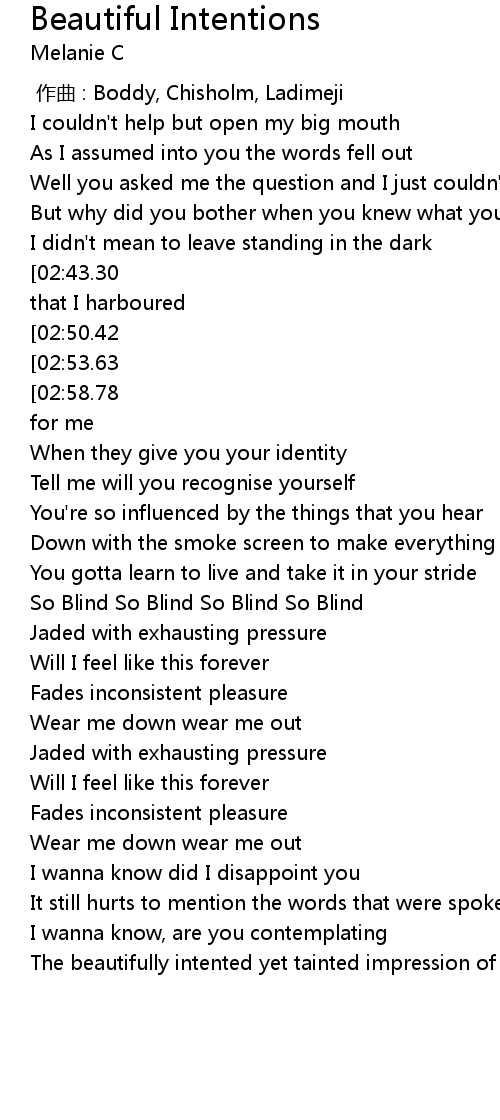| [03:32.16][02:50.42][01:47.99][00:55.55] | Beautiful Intentions for you |