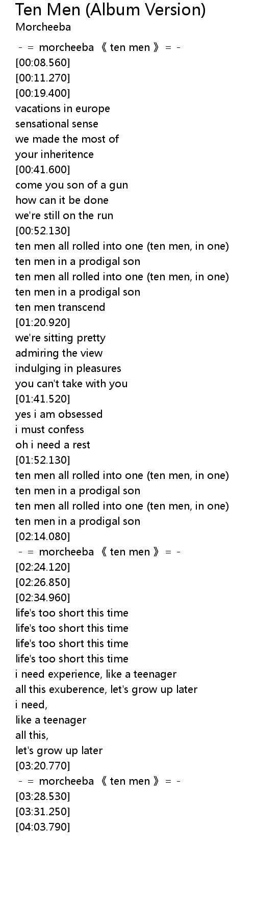 | [00:00.000] | -= morcheeba 《 ten men 》=- |