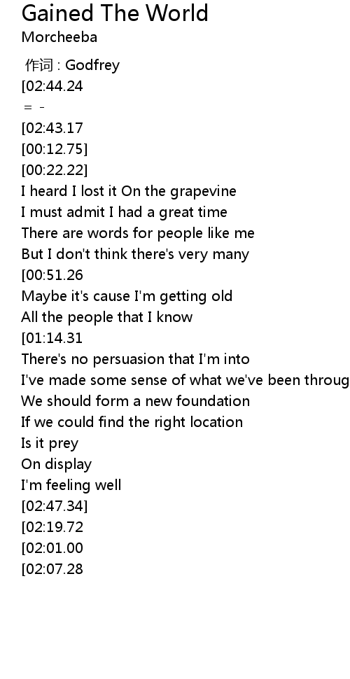 | [00:00.00][02:44.24] | -= Morcheeba 《 Gained The World 》(Feat. Manda) =- |