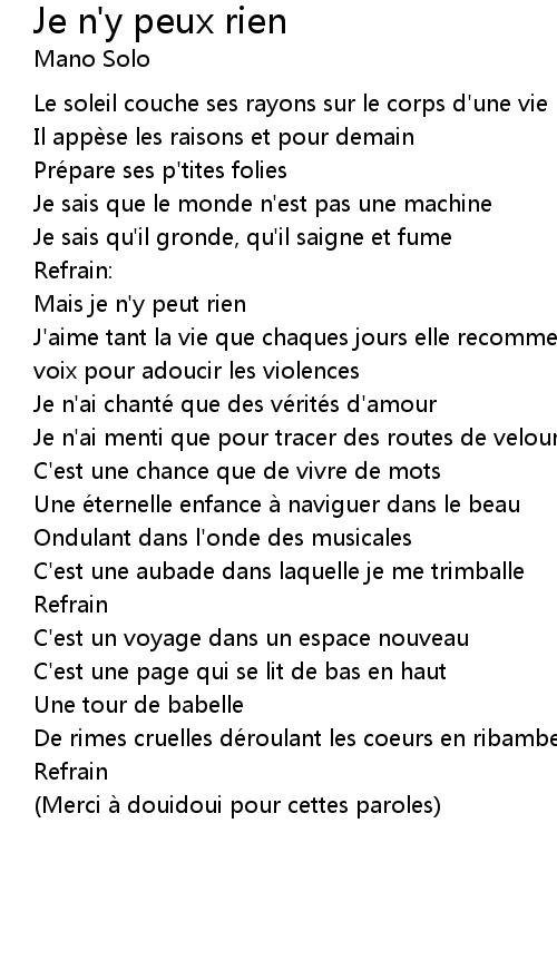 | J' aime tant la vie que chaques jours elle recommense je n' ai cherche qu' une voix pour adoucir les violences | |