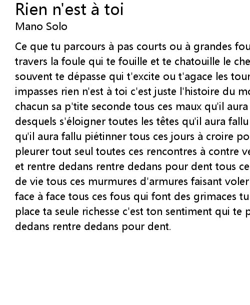 | Ce que tu parcours a pas courts ou a grandes foule es ce que tu de foules a travers la foule qui te fouille et te chatouille le chemin que tu traces qui si souvent te de passe qui t' excite ou t' agace les tours de passepasse au fond des impasses rien n' est a toi c' est juste l' histoire du monde rien n' est a toi chacun sa p' tite seconde tous ces maux qu' il aura fallu soigner tous ces ide aux desquels s'e loigner toutes les t tes qu' il aura fallu briser tous les coeurs qu' il aura fallu pie tinner tous ces jours a croire pour cent tous ces jours a pleurer tout seul toutes ces rencontres a contre vent tous ces oeil pour oeil et rentre dedans rentre dedans pour dent tous ces ch teaux d' effort aux points de vie tous ces murmures d' armures faisant voler les murs toutes ces forces en face a face tous ces fous qui font des grimaces tu t' en fous tu laisses ta place ta seule richesse c' est ton sentiment qui te pousse vers l' avant rentre dedans rentre dedans pour dent. |