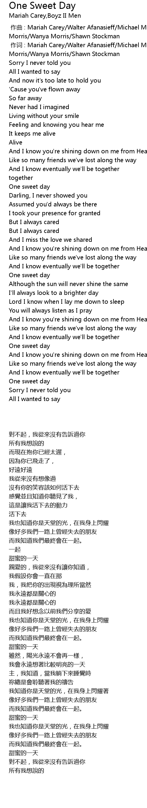 | [00:01.00] | 作词 : Mariah Carey/Walter Afanasieff/Michael McCary/Nathan Morris/Wanya Morris/Shawn Stockman |