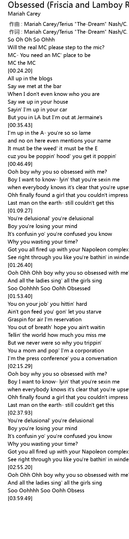 | [02:55.69] | Ooh Ohh Ohh boy why you so obsessed with me? |