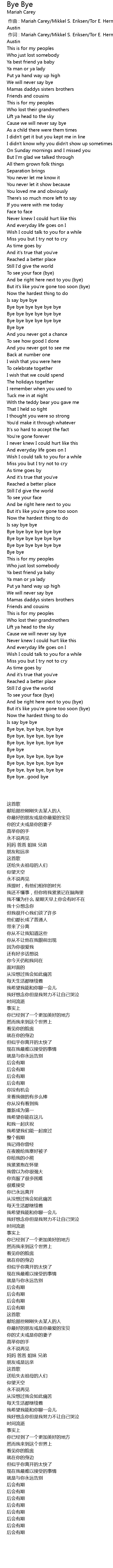 | [00:01.00] | 作词 : Mariah Carey/Mikkel S. Eriksen/Tor E. Hermansen/Johntá Austin |