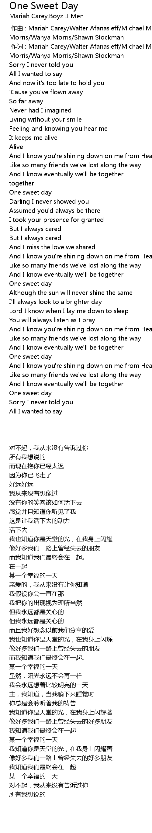 | [00:01.00] | 作词 : Mariah Carey/Walter Afanasieff/Michael McCary/Nathan Morris/Wanya Morris/Shawn Stockman |