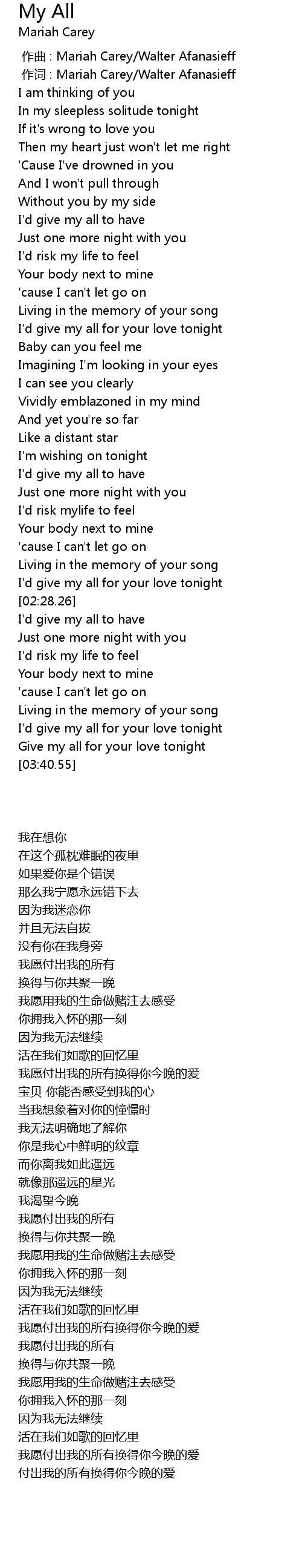 | [00:01.00] | 作词 : Mariah Carey/Walter Afanasieff |