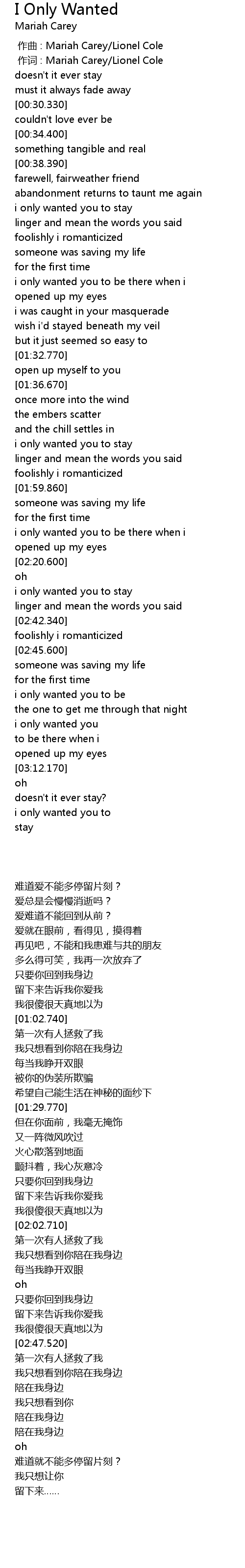 | [00:01.00] | 作词 : Mariah Carey/Lionel Cole |