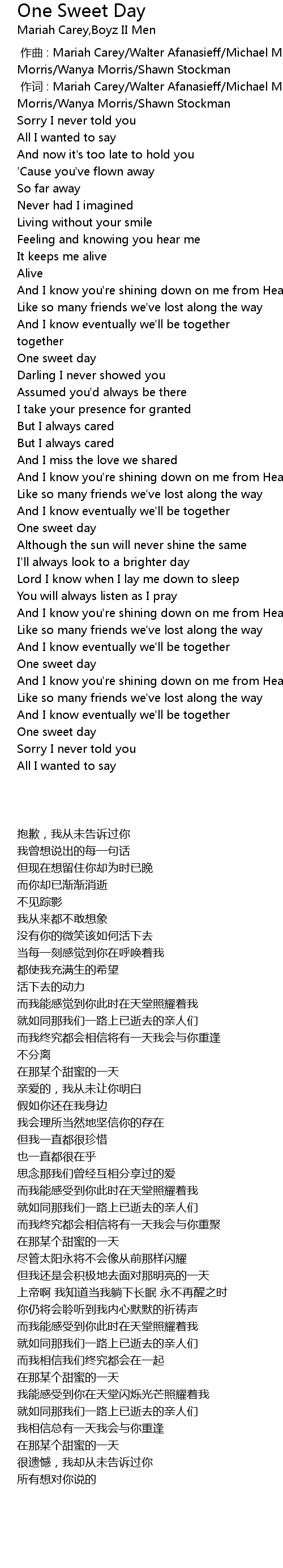 | [00:01.00] | 作词 : Mariah Carey/Walter Afanasieff/Michael McCary/Nathan Morris/Wanya Morris/Shawn Stockman |