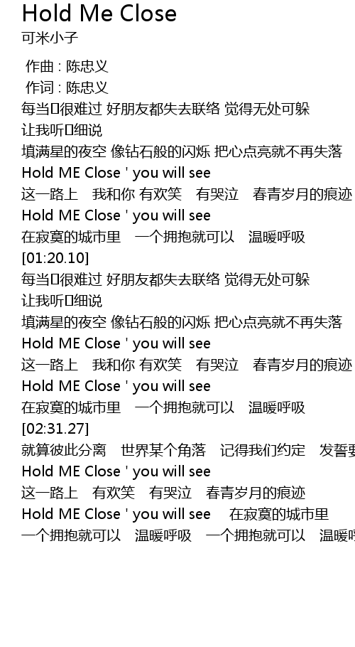 | [03:04.17] | Hold ME Close ' you will see zai ji mo de cheng shi li |