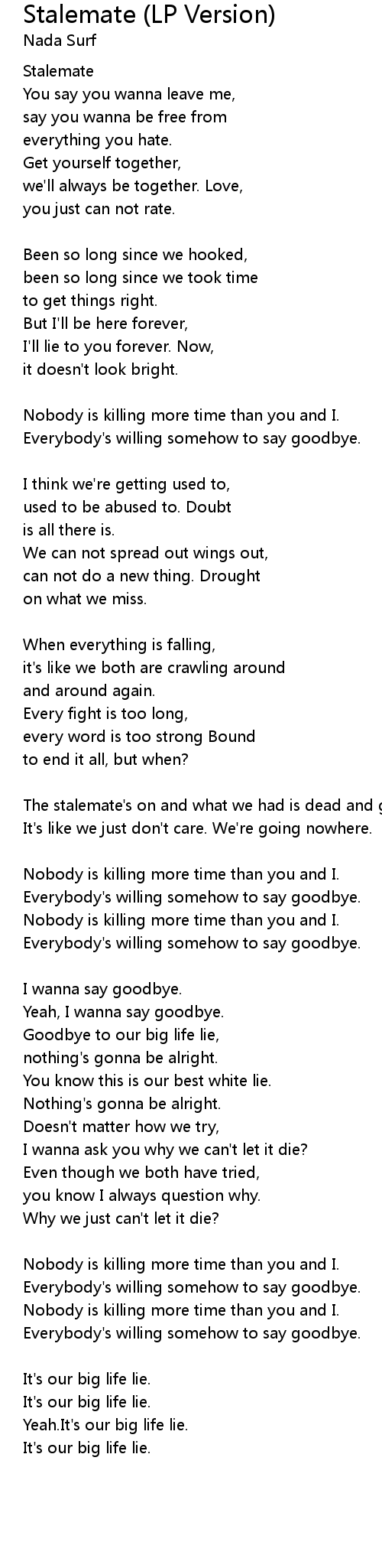 | The stalemate's on and what we had is dead and gone. | |