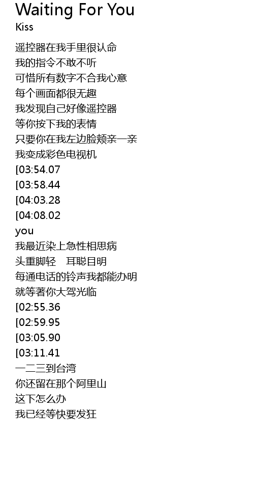| [04:27.35][04:08.02][03:48.90][02:31.18][01:13.87] | yes , I'm still waiting for you |