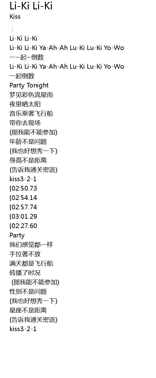| [03:05.22][02:50.73][02:15.40][01:18.90] | LiKi LiKi YaAhAh LuKi LuKi YoWo |