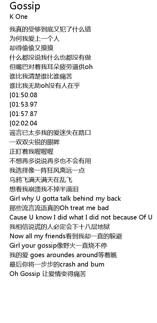 | [01:11.68][01:53.97][02:26.40][02:42.49] | Oh Gossip 是伤人的音符 |
