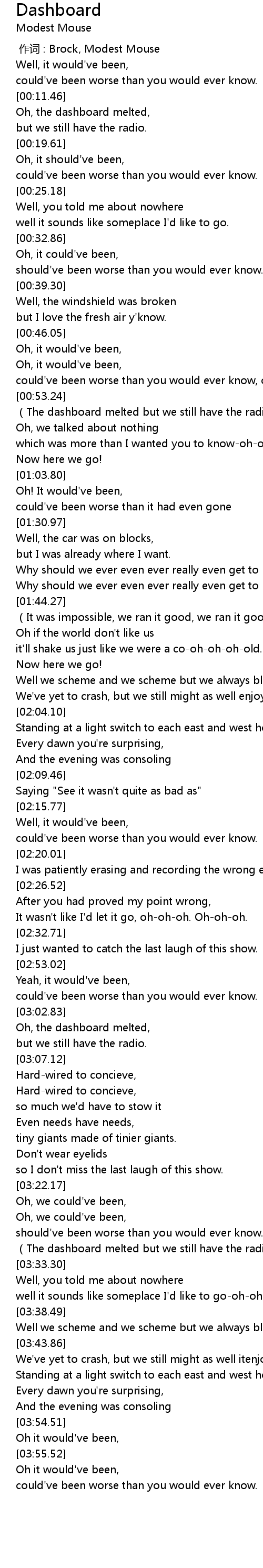 | [00:00.00] | 作词 : Brock, Modest Mouse |
