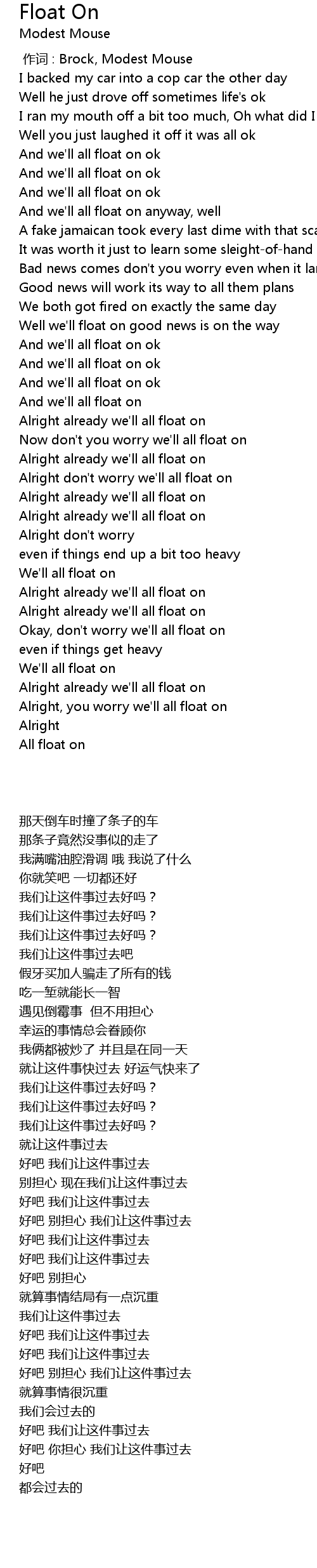 | [02:22.410] | Alright don' t worry we' ll all float on |