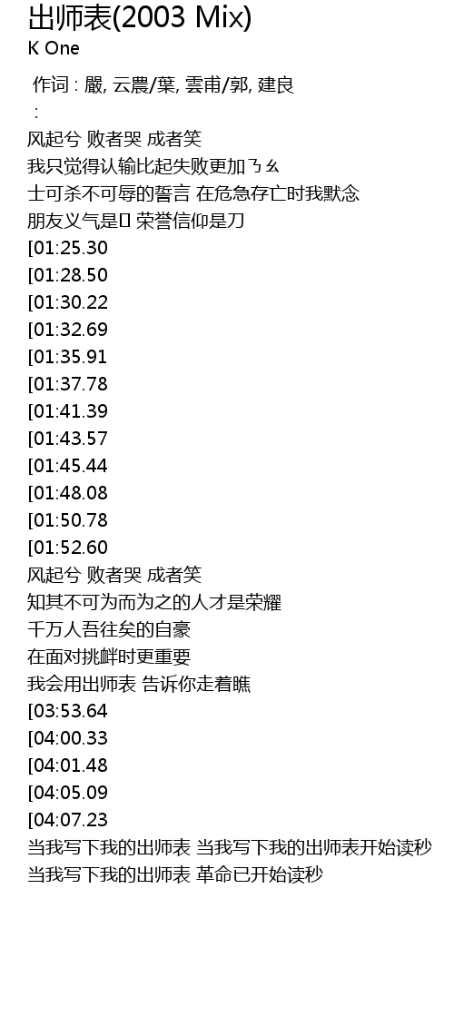 | [04:24.26] | 当我写下我的出师表 革命已开始读秒 |