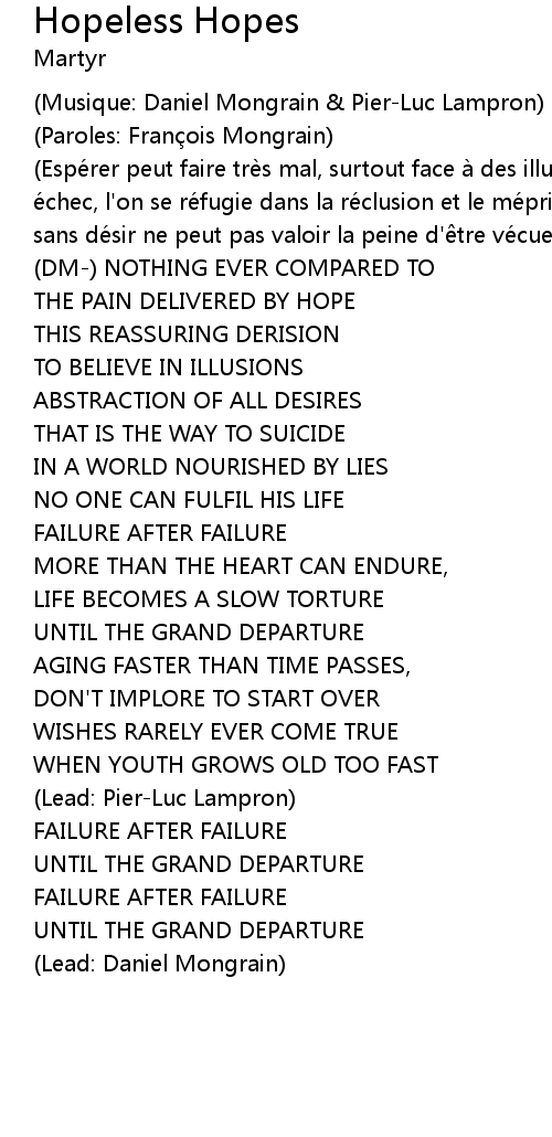 | Espé rer peut faire trè s mal, surtout face à des illusions. É chec aprè s é chec, l' on se ré fugie dans la ré clusion et le mé pris. Toutefois, la vie sans dé sir ne peut pas valoir la peine d' tre vé cue. | |