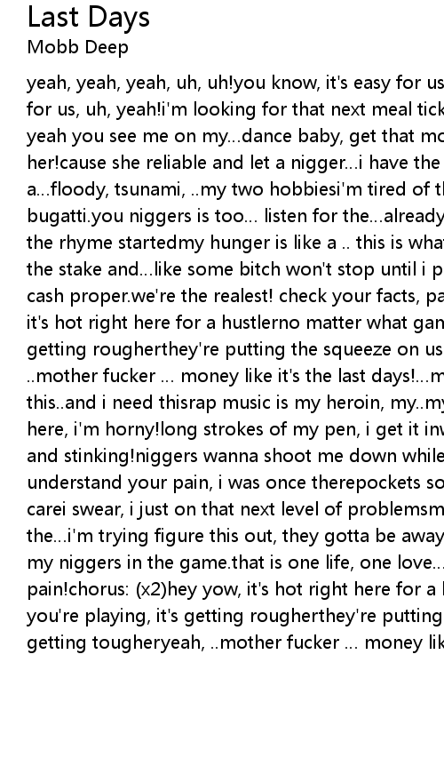 | yeah, yeah, yeah, uh, uh! you know, it' s easy for us, it' harder for them! easy for us, uh, yeah! i' m looking for that next meal ticket i' m in the kitchen, yeah you see me on my dance baby, get that money, i would never knock her! cause she reliable and let a nigger i have the town looking like a floody, tsunami, .. my two hobbiesi' m tired of this way, i need a new bugatti. you niggers is too listen for the already told you what it was when the rhyme startedmy hunger is like a .. this is what it had to offergotta chase the stake and like some bitch won' t stop until i pop hertill i pop her to the cash proper. we' re the realest! check your facts, partner! chorus: x2 hey yow, it' s hot right here for a hustlerno matter what game you' re playing, it' s getting rougherthey' re putting the squeeze on us, times is getting tougheryeah, .. mother fucker money like it' s the last days! my mouth dries i need this.. and i need thisrap music is my heroin, my.. my sex that bitch, come here, i' m horny! long strokes of my pen, i get it inwithout this, i would be and stinking! niggers wanna shoot me down while i' m flying hot.. cause i understand your pain, i was once therepockets so broke it made a nigger not carei swear, i just on that next level of problemsme and the royce or the i' m trying figure this out, they gotta be awayto have it all, still show my niggers in the game. that is one life, one love.. i go harder than the pain! chorus: x2 hey yow, it' s hot right here for a hustlerno matter what game you' re playing, it' s getting rougherthey' re putting the squeeze on us, times is getting tougheryeah, .. mother fucker money like it' s the last days! |