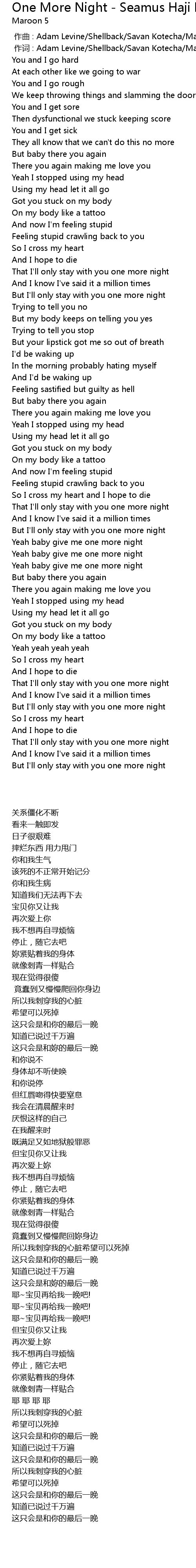 | [00:01.00] | 作词 : Adam Levine/Shellback/Savan Kotecha/Max Martin |